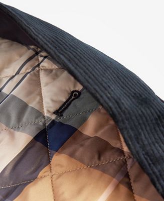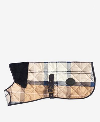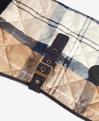 The Barbour Tartan Dog Coat features a plain nylon lining and a classic tartan print with a country-quilted design. It includes a traditional corduroy collar detail, a Velcro fastening strap around the neck, and an under-body strap with a brass grommets to secure it to your dog. A leather branding badge and a keyhole opening for a harness complete this exquisite quilted tartan dog coat by Barbour.