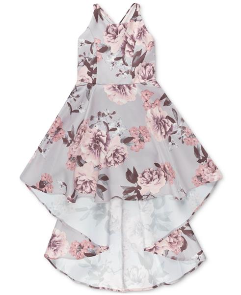 This sleeveless high-low dress features a woven floral pattern with sparkling back accents, creating a stylish, elegant look perfect for parties or special occasions.